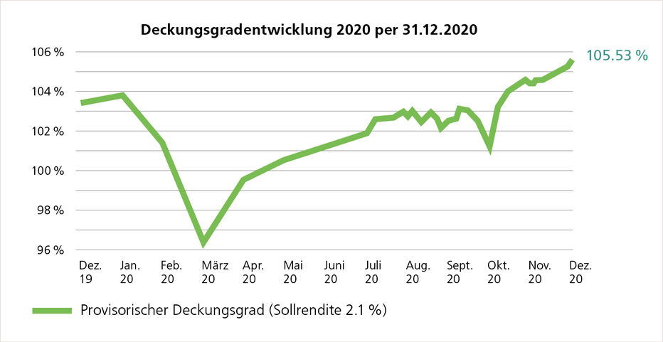 Per 31. Dezember 2020 weisen wir eine Gesamtperformance nach Kosten von sehr guten 4.24 Prozent aus (Benchmark 4.36 Prozent). Der provisorische Deckungsgrad liegt per 31. Dezember 2020 bei 105.53 Prozent. Dies unter der Berücksichtigung einer Sollrendite von 2.1 Prozent (Verzinsung der Altersguthaben der Versicherten von 2 Prozent).