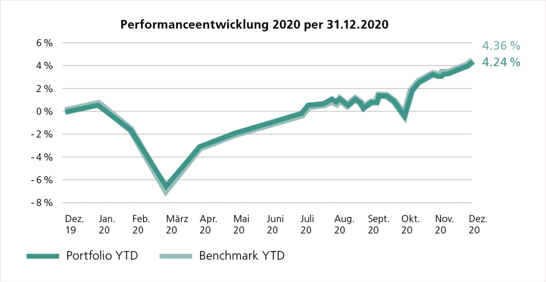 Nicht zuletzt dank unserem regelbasierten Rebalancing-und Bandbreitenkonzept profitierten wir von der markanten Markterholung zum Jahresende. Mit dem sogenannten Rebalancing stellen wir sicher, dass der prozentuale Anteil, den bestimmte Sektoren, Länder oder Währungen im Gesamtportfolio ausmachen, auch bei grösseren Schwankungen erhalten bleibt. Das Bandbreitenmodell regelt, innerhalb welcher festgelegten Grenzen Wertschwankungen des Gesamtportfolios erlaubt sind. Werden diese über- oder unterschritten, leiten wir Korrekturmassnahmen ein.