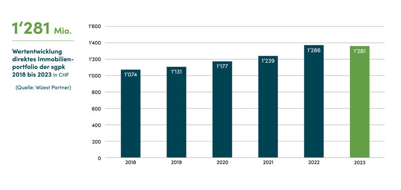 Insgesamt sind 78 Liegenschaften in die Jahresbewertung der direkten Immobilien per 31. Dezember 2023 eingeflossen. Das direkte Immobilienportfolio der sgpk ist damit im Zeitraum von 2018 bis 2023 um rund 19 Prozent von CHF 1'074 Mio. auf CHF 1'281 Mio. gewachsen, und die Anzahl Liegenschaften ist von 71 auf 78 gestiegen. Der Marktwert der Immobilien inklusive der Beteiligungen an Anlagestiftungen lag per 31. Dezember 2023 bei CHF 1'382 Mio. Er hat sich somit gegenüber dem Vorjahr um CHF 53 Mio. verändert (CHF 1'435 Mio. per 31. Dezember 2022).
