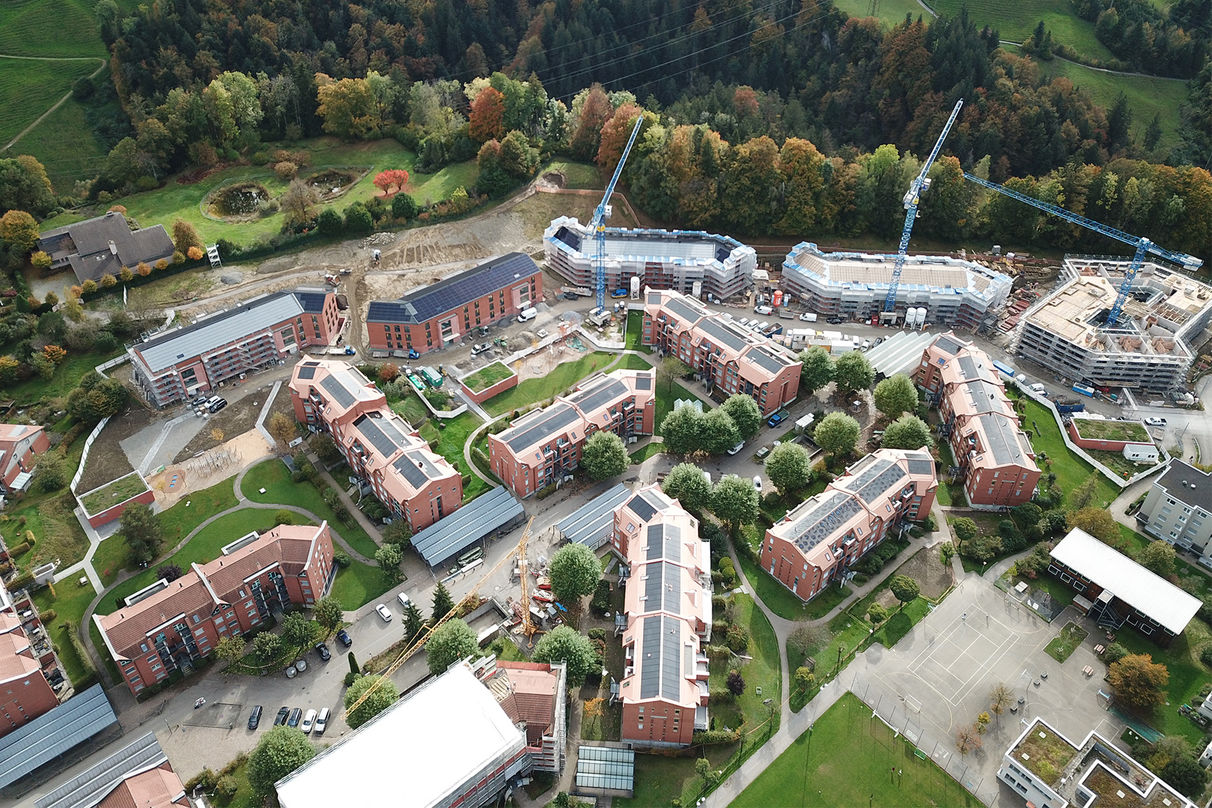 Mit dem Baustart im Jahr 2023 nahm das bislang grösste Photovoltaikvorhaben in unserem Portfolio konkrete Formen an. Bis Ende 2025 werden auf den Neubauten rund 1'600 Solarpanels mit einer Gesamtleistung von 650 kWp installiert. Parallel dazu erfolgte die Dachsanierung der sieben bestehenden Mehrfamilienhäuser – auch diese wurden mit 800 Modulen ausgestattet und liefern künftig zusätzliche 320 kWp Solarleistung. Die Arbeiten am Bestand konnten bereits Ende 2024 erfolgreich abgeschlossen werden.