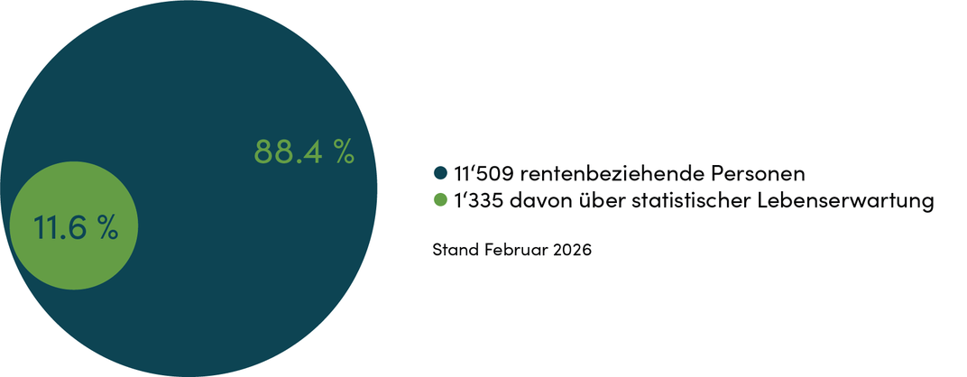 Eine Analyse unseres sgpk-Versichertenbestands zeigt: 1’335 Personen bzw. 11.6 Prozent beziehen derzeit eine Rente, obwohl sie die vorhin genannte statistische Lebenserwartung bereits überschritten haben: