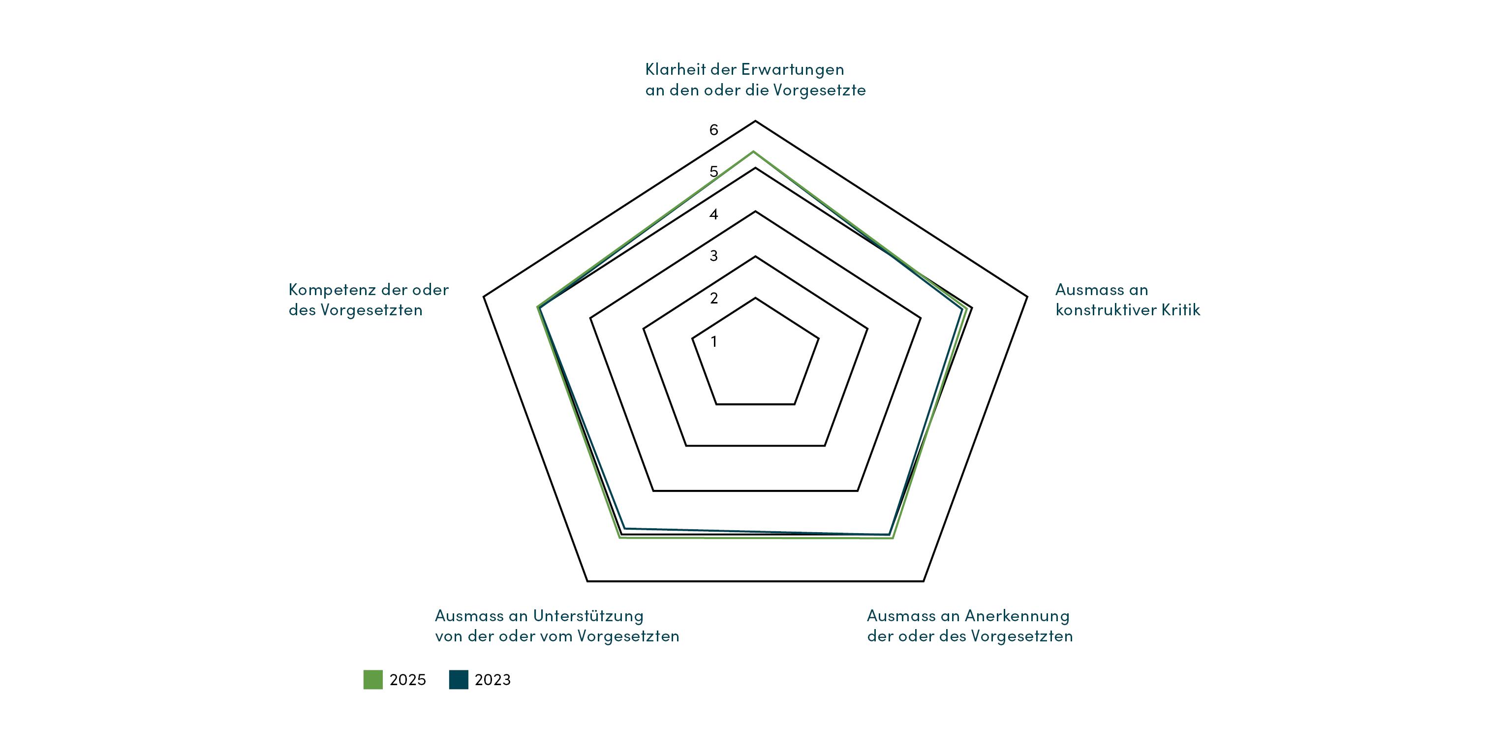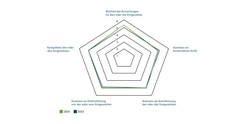 Auch die Führungskultur wird von unseren Mitarbeiterinnen und Mitarbeitern insgesamt positiv beurteilt. Klare Ziele, transparente Kommunikation sowie Unterstützung durch Weiterbildung und Know-how-Transfer werden als hilfreich erlebt. Gegenüber der letzten Befragung zeigt sich in diesem Bereich eine leichte Verbesserung.