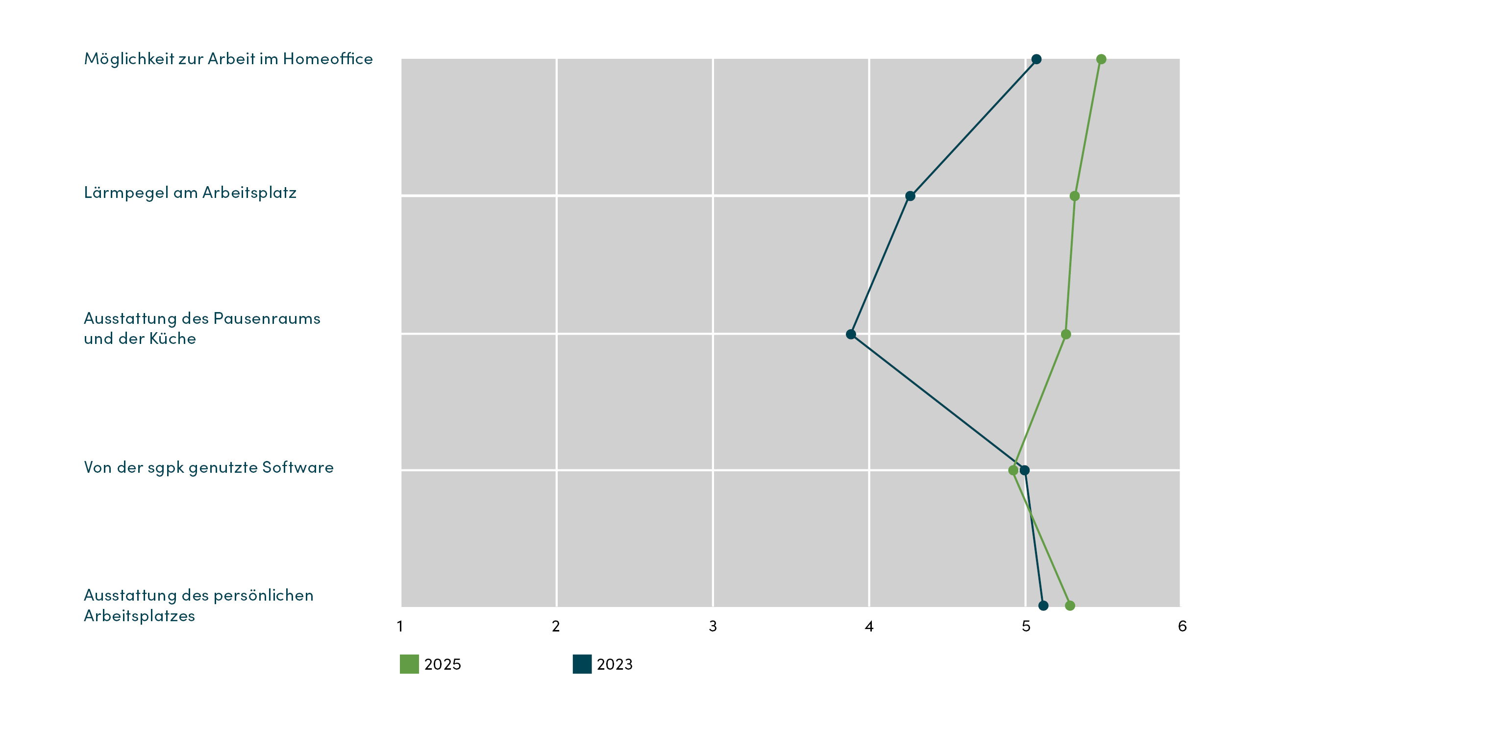 Ein konkreter Fortschritt gegenüber der letzten Befragung konnte im Zusammenhang mit unserem Pausenraum erzielt werden: Durch die optimierte Raumgestaltung ist die Zufriedenheit deutlich gestiegen. Besonders freut uns, dass der Raum rege und fachbereichsübergreifend genutzt wird und damit auch den informellen Austausch im Arbeitsalltag unterstützt.