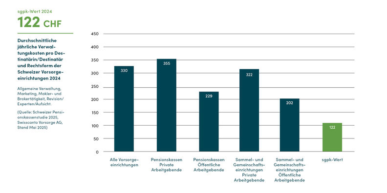 Die Verwaltungskosten pro versicherte Person beliefen sich bei der sgpk im Jahr 2024 auf durchschnittlich 122 Franken pro versicherte Person, im Vorjahr lag der Wert bei uns bei 111 Franken. Dieser Anstieg hat gute Gründe: Wir haben im vergangenen Jahr in die Flexibilisierung der Leistungen für unsere Versicherten investiert und die Kontakt- und Informationsmöglichkeiten weiter ausgebaut.