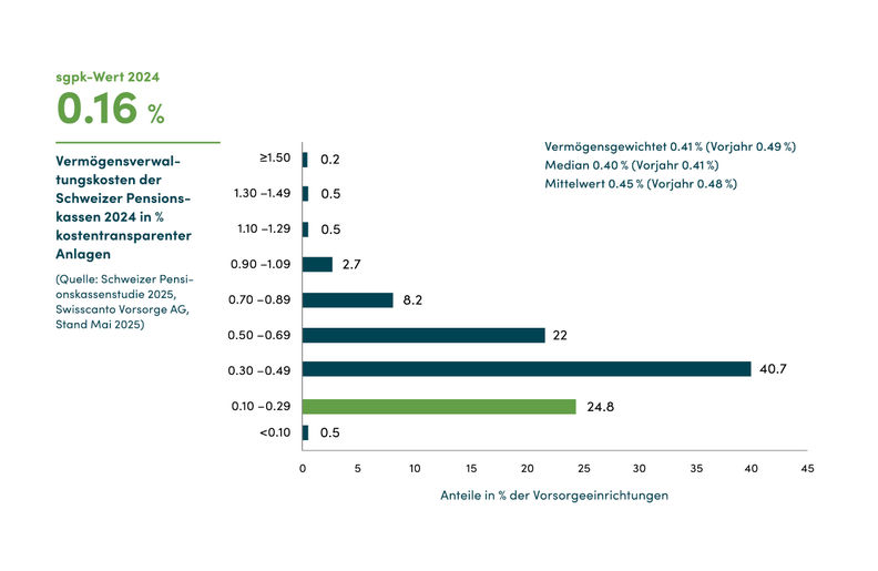 Gemäss der aktuellen Swisscanto-Studie sanken die Kosten für die Vermögensverwaltung der Schweizer Pensionskassen im Jahr 2024 auf durchschnittlich 0.41 Prozent, nach 0.49 Prozent im Vorjahr.
