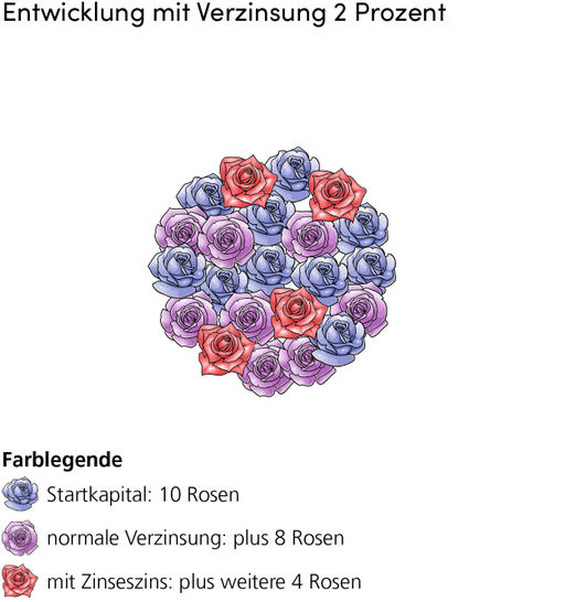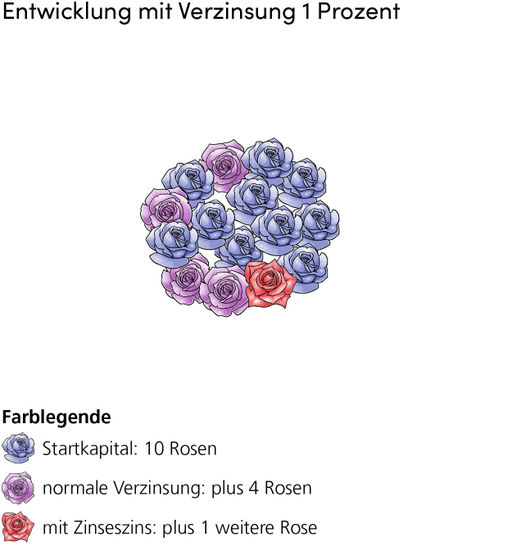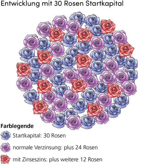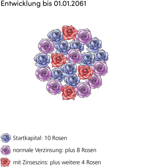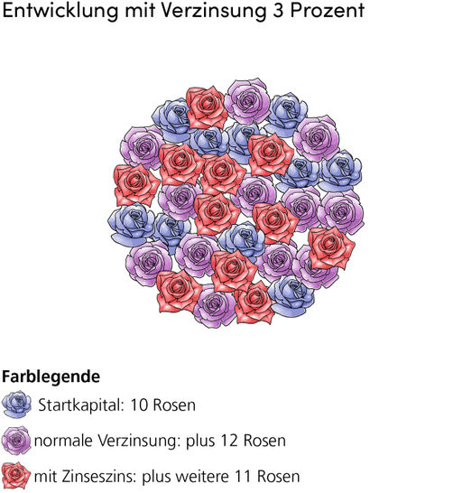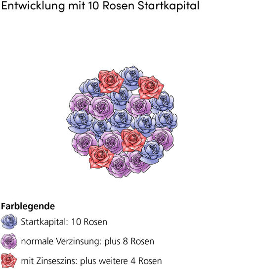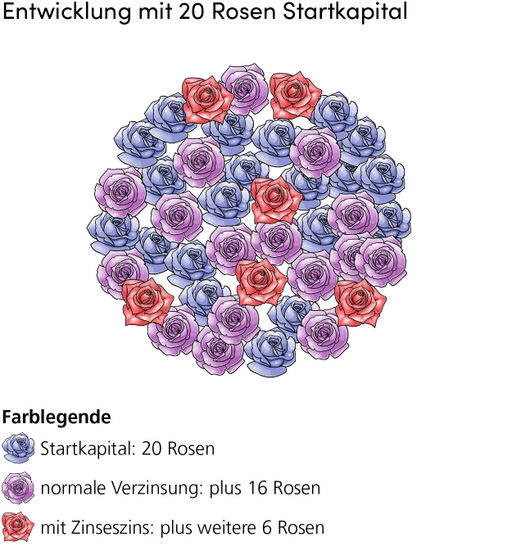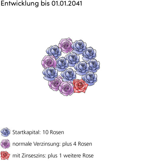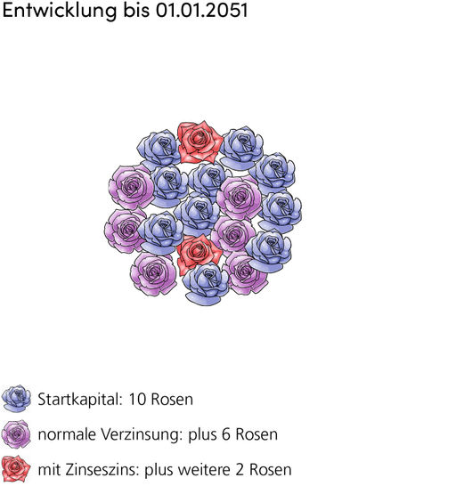 Der Zinseszinseffekt wird gerne unterschätzt. Unsere drei Rechenbeispiele zeigen Ihnen anhand eines Rosenstrausses, wie sich die Faktoren «Kapital», «Rendite» und «Zeit» auf seine Grösse auswirken: