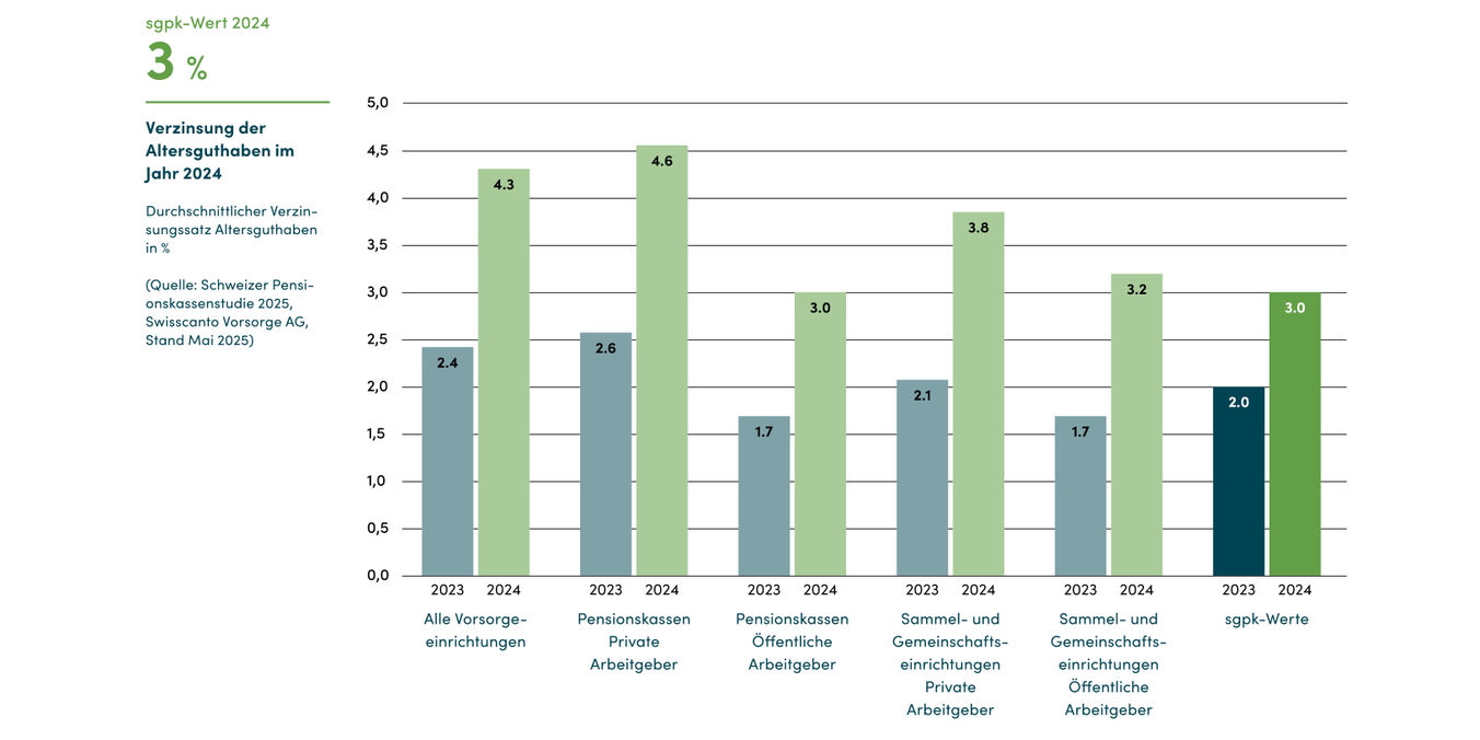 Dass wir gleichzeitig die Qualität unserer Anlagetätigkeit auf einem äusserst wettbewerbsfähigen Niveau halten, zeigt der zweite Blick in die Swisscanto Pensionskassenstudie 2025: Mit einer Jahresrendite von 9.73 Prozent nach Kosten im Geschäftsjahr 2024 liegen wir deutlich vor den besten Kassen, sie erzielten gemäss Studie eine Nettoperformance von 7.6 Prozent.