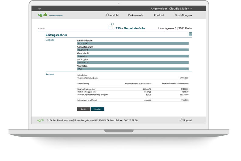 Mit dem integrierten Beitragsrechner simulieren Sie Lohnänderungen, beispielsweise im Fall von Neueintritten, Pensumsänderungen, beim Wechsel von Sparplänen, bei Saläranpassungen etc. Beraten Sie Ihre Mitarbeitenden stets auf der Basis aktueller Zahlen.