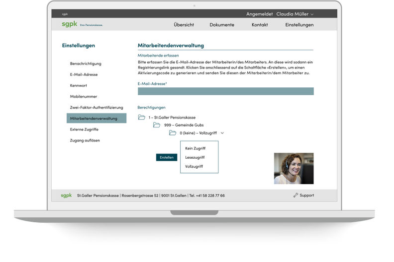 Hinterlegen oder löschen Sie interne und externe Benutzerinnen/Benutzer Ihres sgpk-Arbeitgeberportals als verantwortliche Person jederzeit direkt selbst im System und erteilen Sie die gewünschten Berechtigungen.